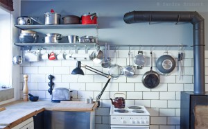 Zum anderen sind es die schönen Kleinigkeiten. Wie beispielsweise die alte, schwarze Dreiersteckdose unter den Töpfen, die noch original ist. Oder der Wasserhahn, der direkt aus der Fensterbank kommt und sein Wasser in ein großes, viereckiges Industriewaschbecken abgibt. Die alte Metallwaage. Der alte Emailleteekessel. Es ist einfach stimmig und offensichtlich mit viel Liebe zu Detail ausgesucht, ohne dabei lieblich zu wirken.