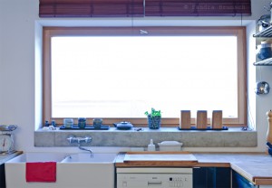 Selbst an regnerischen Tagen fällt auf, wie hell diese Küche ist. Die große Fensterfront geht zum Garten und die Betonfensterbank ziert japanisch angehauchte Deko, die dem Asia- Faible des Hausherrn Rechnung trägt. Daneben geht eine hohe Tür auf die Terasse hinaus, auf der im Sommer gesessen und ein gutes Glas Wein getrunken wird. Die Fensterrahmen sind aus Holz, damit kein Kunststoff den Gesamteindruck ruiniert.