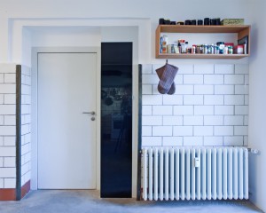 Um die gesamte Raumstruktur mit den breiten Fenster- und Türleibungen zu erhalten – und um stilecht Stauraum zu schaffen – haben die beiden in einen der Türbögen einen Einbauschrank gebaut. Wie alles in dieser Küche selbst geplant und verwirklicht. Dabei wurde alt (Türbogen) und neu (IKEA-Schranktür) kreativ miteinander kombiniert. Ebenfalls beibehalten wurden auf beiden Seiten der Küche die Kacheln – sie waren ganz offensichtlich ein wichtiger Bestandteil des alten Schlachthauses und wurden quasi als Ur-Mutter aller Fliesenspiegel neuer, alter Bestimmung zugeführt.