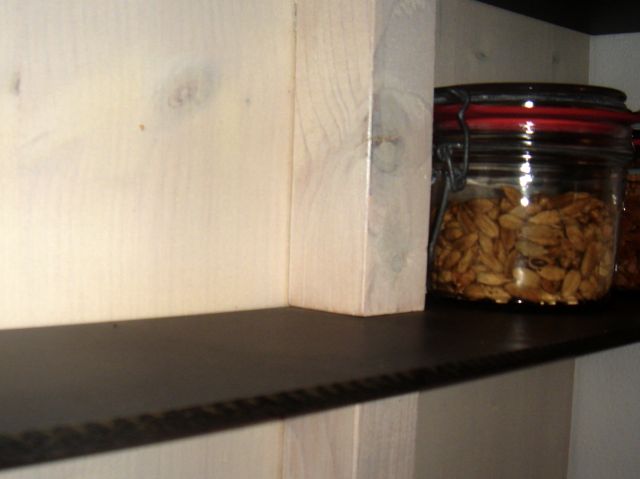 Da wir ja ab und zu etwas bauen, hatten wir auch noch ein Brett übrig, eine leiste findet sich immer. Die Schrauben waren wohl wieder mal teurer als der Rest. Der ursprüngliche Plan, die Möbelplatten freischwebend in einen Balken zu setzen, erwies sich als unhandlich, da so ein Gewürztütchen nur 2 Millimeter braucht, um durchzurutschen.